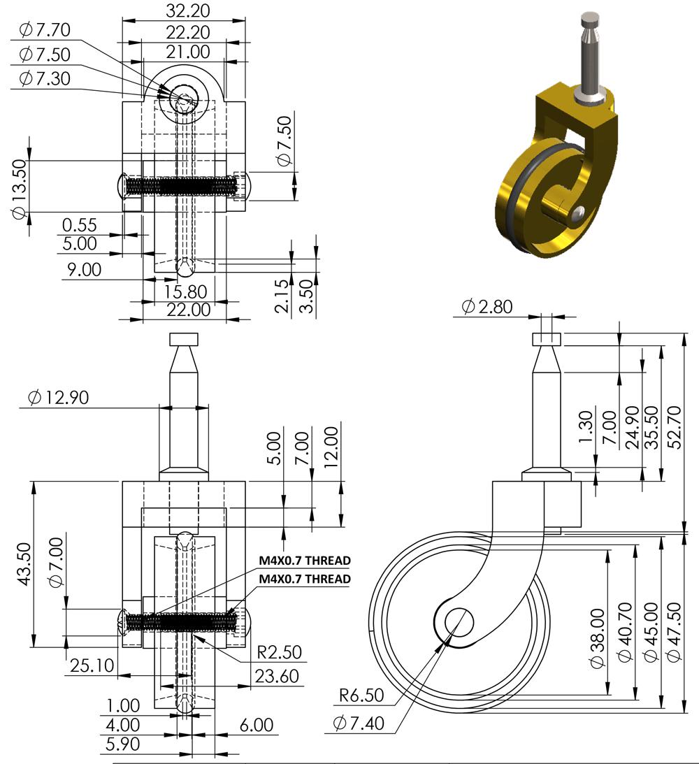 Quality manufactured solid brass castor with a rubber tyre, and polished brass finish. A push socket is included with each castor and these are easily fitted to your furniture just by tapping them into position. Widely used throughout the upholstery, interior design and furniture industry.